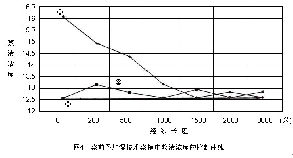 圖4為漿液濃度控制曲線,曲線③為設立的最低漿液濃度值,低于這個曲線的漿液濃度會影響上漿率。曲線②為正常生產中受傳感器控制,漿液濃度則于不斷自動補充較濃的漿料,使漿槽中漿液濃度不會出現低于設定的濃度最低值。曲線①為新開車時由于漿槽中漿液濃度較高,預加濕后的經紗經過1000~2000米后漿液濃度會接近設定的最低值,傳感器開始工作,通過儲貯漿桶自動補充濃漿液過程即進入曲線②的自動控制漿液濃度的狀態