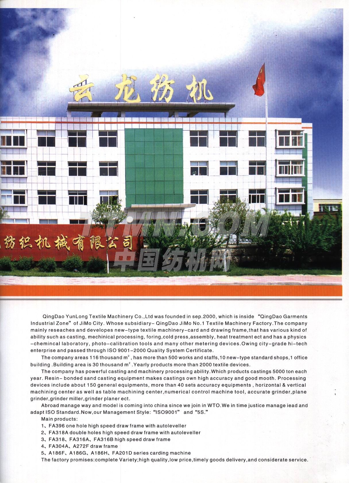 青島云龍集團成立于1978年9月,是一家集設計、開發、生產、銷售、服務于一體的專業生產棉紡設備的高新技術企業。公司擁有進出口經營權,并獲得了ISO9001:2008質量體系認證證書 。