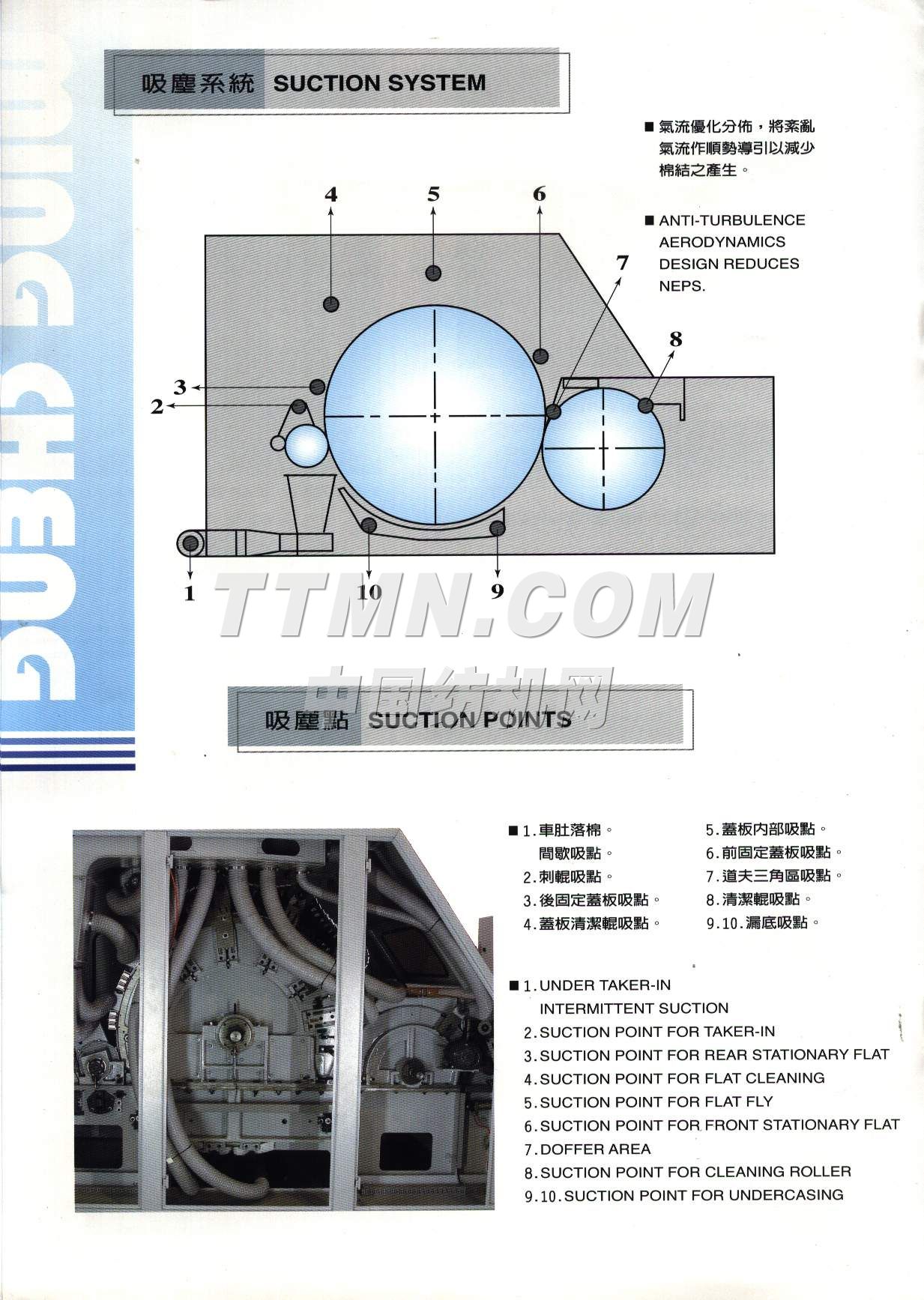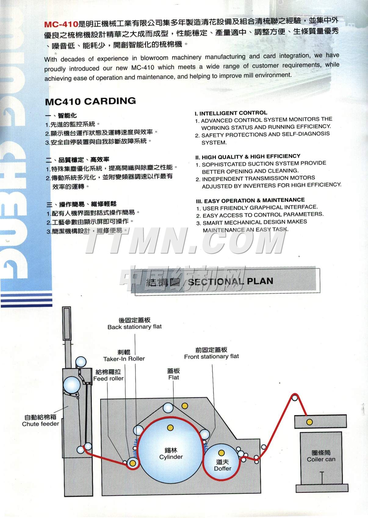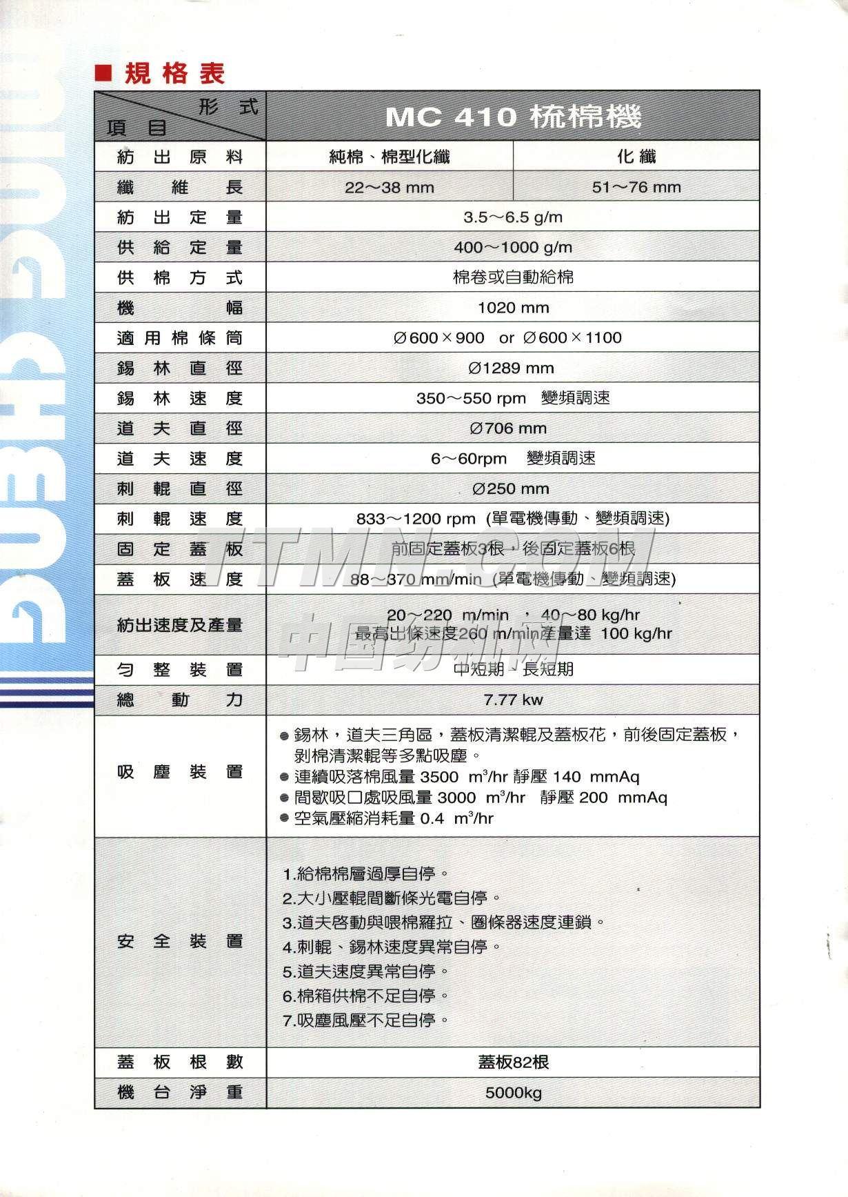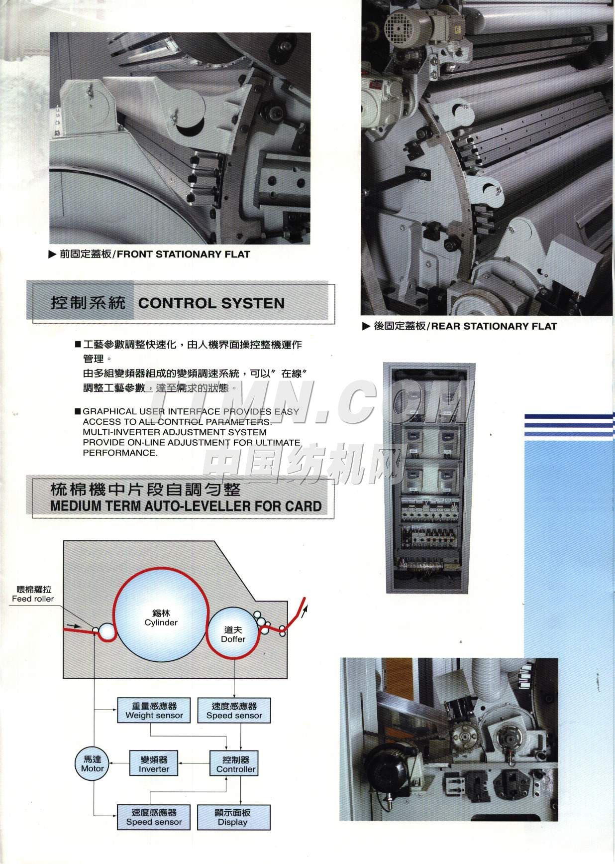| 主要生產(chǎn)紡織機(jī)械,清花機(jī)械設(shè)備,自動(dòng)開(kāi)棉機(jī), 旋轉(zhuǎn)式、往復(fù)式,自動(dòng)混棉機(jī)(6箱、8箱、10箱),高速梳棉機(jī),梳棉自動(dòng)喂棉箱,高效開(kāi)纖清綿機(jī),不織布機(jī)械(人造皮革超細(xì)纖維針軋土木工程不織布),濾塵機(jī), 紡織業(yè)用,棉花及棉紗用金屬,火花偵測(cè)排除系統(tǒng)