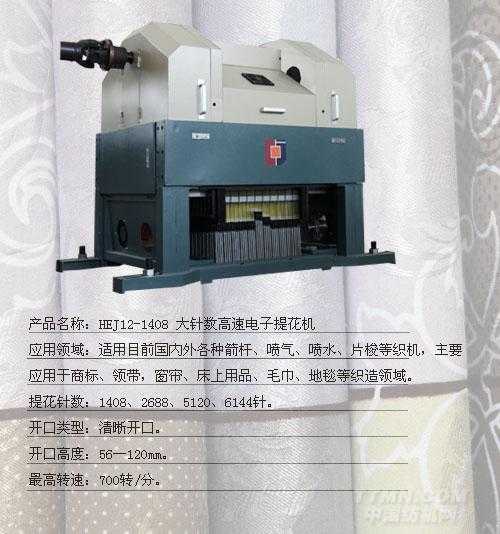 1408針電子大提花機,整合了先進的設計理念,結(jié)構更優(yōu)化,功能更強大。適用目前國內(nèi)外各種箭桿、噴氣、噴水、片梭等織機,主要應用于商標、領帶,窗簾、床上用品、毛巾、地毯等織造領域。