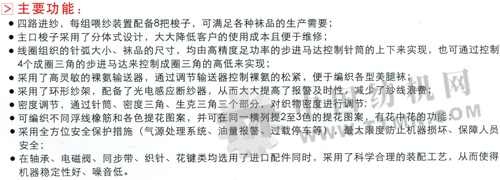 本設(shè)備可編織平紋,網(wǎng)眼,提花組織,一橫列可編織3色圖案組織,花中花,可選針局部達松,廣泛適用于尼龍絲、包芯絲、天鵝絨、錦綸、牛奶絲等原料的絲襪織品,織品主要有各型提花襪、高檔含花中花組織的提花襪、對對襪、中統(tǒng)襪、長統(tǒng)襪、連褲襪、九分褲、連身襪等。