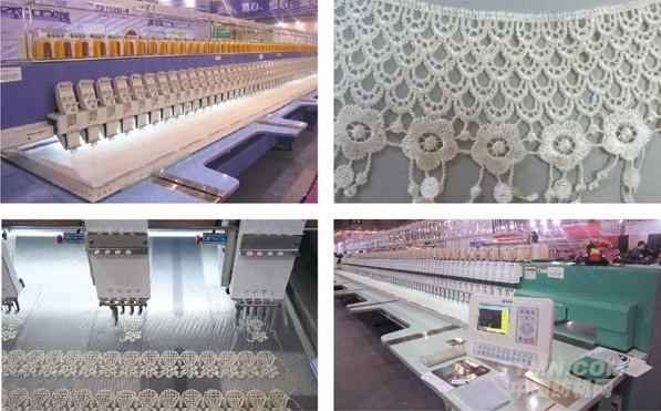 高速和多頭是近幾年繡花機產業的主要發展方向,其核心目標就是提高單臺繡花機生產率。高速可以實現單位時間內刺繡針數的提高,多頭可以實現同一時間繡作更多的產品。近兩年來,超多頭刺繡機已經在整個刺繡機行業悄然興起,大幅效率的提升是該種機型的亮點所在。特別是水溶花邊加工市場,超多頭刺繡機已經開始逐步替換和淘汰以前的普通刺繡機,機器的加工幅面也從原來的5碼,提升到7.5碼,甚至10碼左右,加工幅面大小和效率可以替代傳統飛梭式刺繡機。超多頭刺繡機可以產生普通刺繡機將近一倍的利潤。