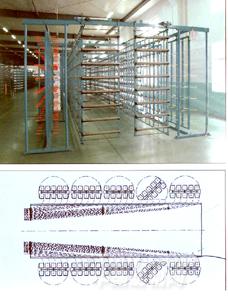 V型循環式筒子架主要和整經短纖維的分批整經機配套使用。主要優點是架身短,架子與伸縮筘間無倒紗器,特別適用對摩擦敏感的短纖維,實現低張力水平高速運行,有利于減少紗線的張力差異和整經時候的斷頭率。交錯的紗筒布置優化了空間利用,V型內側可存放預備筒子架,便于工人操作,換筒時間短,減少整經時停車時間。該筒子架特別適應高速整經。