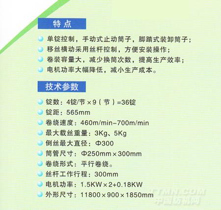 本機是化纖倍捻機的后道設備,把倍捻機上的卷取筒子倒成大卷裝,與無梭紡機配套以減少停機時間,提高功效。