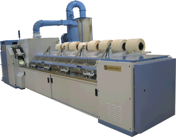 8、 棉網輸送及成條: 特制棉網輸送羅拉,喇叭口,壓輥使棉網聚合成均勻的條子。每個梳理頭均有一個相應的電子監測器以識別個別梳理頭有否問題,甚至識別加工時可能產生之疵點。