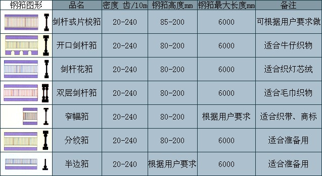 劍桿筘、片梭筘系采用引進(jìn)德國(guó)、日本的先進(jìn)生產(chǎn)技術(shù)及設(shè)備所生產(chǎn),是無(wú)梭織機(jī)的配套產(chǎn)品,產(chǎn)品質(zhì)量屬?lài)?guó)內(nèi)領(lǐng)先水平。