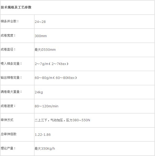 本機將經過預并后的棉條并合、牽伸,形成棉層,并卷繞成一定規格、重量及密度的棉卷,供精梳機使用。