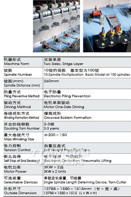 主要適用于棉、毛、滌、化纖及混紡的合股加工,也可適用于氨綸并紗,把不同規格的原料筒子并成倍捻機上加工的平行筒子。
