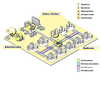 網(wǎng)絡(luò)的另一個功能是控制系統(tǒng),透過染廠網(wǎng)絡(luò)使流程之間相互調(diào)節(jié)和發(fā)揮最佳效能。還可聯(lián)系訂單管理到機(jī)器的控制單元上,從而組成一個完整的染廠網(wǎng)絡(luò)。
