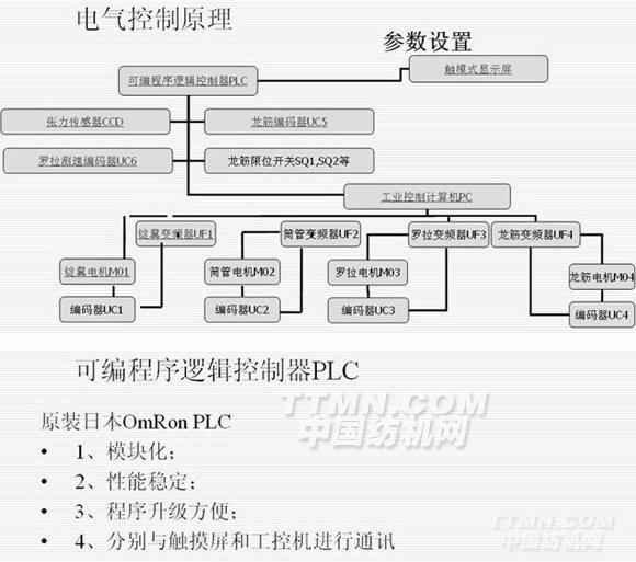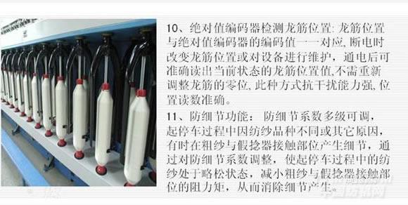 機(jī)型概況:該機(jī)型采用現(xiàn)金的PLC、工業(yè)計(jì)算機(jī)控制技術(shù)和工程電子齒輪技術(shù)替代傳統(tǒng)粗紗機(jī)的成形機(jī)構(gòu)、錐輪機(jī)構(gòu)、差速機(jī)構(gòu)以及除牽伸以外的所有工藝配換齒輪,是目前國內(nèi)最先進(jìn)機(jī)電一體化高速懸錠粗紗機(jī)。