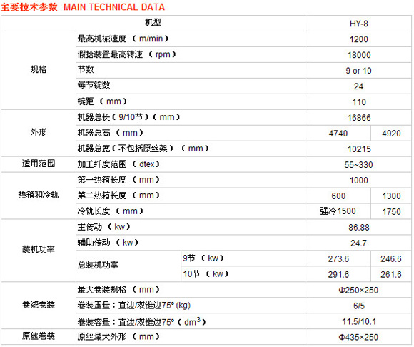 HY-8型高速彈力絲機(jī)是宏源公司根據(jù)國際上假捻變形技術(shù)的發(fā)展趨勢自主開發(fā)的新型全自動落筒型機(jī)。該產(chǎn)品的自動化、機(jī)電一體化程度很高,適應(yīng)現(xiàn)代化企業(yè)的需要。最高機(jī)械速度達(dá)1200m/min。