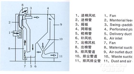 本機是利用先進技術設計生產的。此種高效率強力除微塵機通常用于開清棉流程上最后一個除塵點,纖維上的短絨及微塵均被直接吸風排走。由于此機只有少數的活動部分,因此所需維修極少。對于現今采用的氣流紡紗和噴氣紡機,采用開機尤為重要,它能大大降低因纖維含塵而導致的斷頭事故。