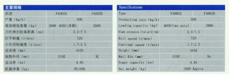 FA002A和FA002B均采用鋸齒刀片打手,自里外刀片由稀到密分為三組,使抓取的纖維束小而均勻,有利于后道工序開(kāi)松、混合、除雜。