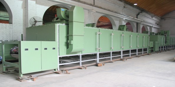 1、產品用途 本機用于粘膠短纖維后處理工序的前區烘燥,使精煉后經濕開棉機開松的粘膠短纖維進行預烘去部分水份,然后經喂給再開松后進入后區烘燥。 本機由進出口機架、烘房機架、勻風板、循環風機、排氣風機、管路、散熱器、隔熱門、主動傳和鏈板等部件組成。全機烘房共計4節,烘房框架采用積木式組合結構。 2、主要技術參數 機器型式: 連續鏈板式 產量: 1萬噸/年(30噸/天) 進機回潮率: 150% 出機回潮率: 80% 機器工作寬度: 1800㎜ 機器工作高度: 1350㎜ 側封型式: 密封板、密封條 使用蒸汽壓力: 0.5MPa 鏈板速度: 0.7~4.2m/min(無級變速) 烘房組成: 4節 烘房溫度: 約130℃ 總散熱面積: 860㎡ 溫度控制方式: 鉑熱電阻測溫,氣動薄膜調節閥控制溫度調節 裝機功率: 約51KW 蒸汽耗量: 約900㎏/h 全機外形尺寸: 12200×3280×3570㎜ 全機重量: 約18噸