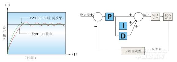 風(fēng)機、泵類、空壓機、鍋爐、中央空調(diào)等負(fù)載大部份屬于遞減矩特性,通過PID調(diào)節(jié)即可作為閉環(huán)回 路控制。KV2000變頻器采用最新模糊控制技術(shù),形成最佳的 PID 調(diào)節(jié)功能(參考附圖與傳統(tǒng)變頻器PID 的比較)。