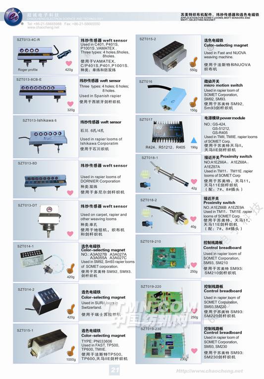 超誠電子科技有限公司在產品開發領域:成功研發出提花機電磁鐵、抬緯電磁鐵、電子多臂機電磁鐵、儲緯器電磁針、接近開關、緯紗傳感器、光電開關、光電探緯器、固態繼電器等產品,部分產品獲得了國際UL認證、CE認證等,受到了國部委的多次嘉獎。特別是本公司的高頻率提花機電磁鐵(SZT-003)、電子多臂機電磁棒(SZT-001-20)、節能型提花機組件(M5)、新型氣閥電磁鐵(TAU-2536),成為了國家商新技術產品,并通過了上海市高新技術成果轉化,得到了國家重點產品保護,本公司也被確認為全國質量、信譽雙保障示范企業,中國質量誠信委員會AAA級質量誠信會員,中國質量誠信促進會質量誠信消費者(用戶)信得過單位。
