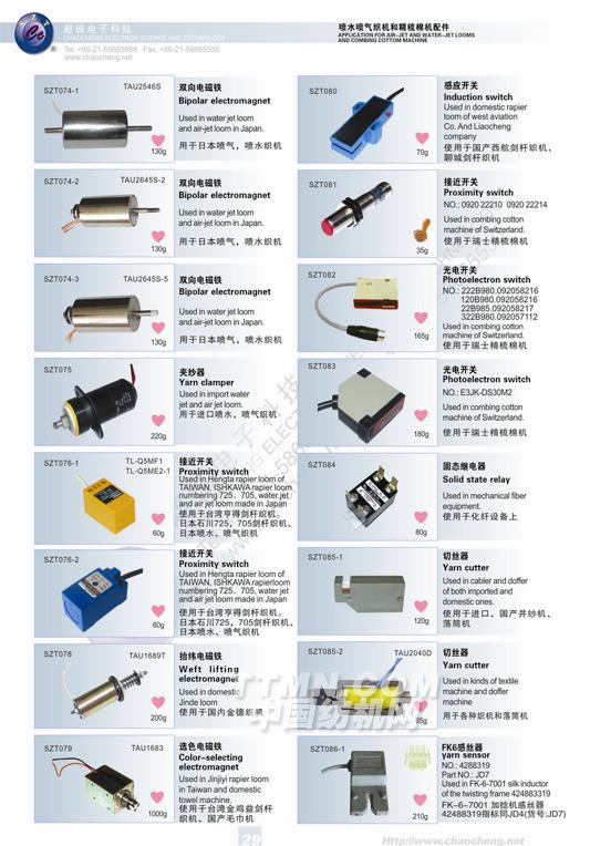 超誠電子科技有限公司在產(chǎn)品開發(fā)領(lǐng)域:成功研發(fā)出提花機電磁鐵、抬緯電磁鐵、電子多臂機電磁鐵、儲緯器電磁針、接近開關(guān)、緯紗傳感器、光電開關(guān)、光電探緯器、固態(tài)繼電器等產(chǎn)品,部分產(chǎn)品獲得了國際UL認證、CE認證等,受到了國部委的多次嘉獎。特別是本公司的高頻率提花機電磁鐵(SZT-003)、電子多臂機電磁棒(SZT-001-20)、節(jié)能型提花機組件(M5)、新型氣閥電磁鐵(TAU-2536),成為了國家商新技術(shù)產(chǎn)品,并通過了上海市高新技術(shù)成果轉(zhuǎn)化,得到了國家重點產(chǎn)品保護,本公司也被確認為全國質(zhì)量、信譽雙保障示范企業(yè),中國質(zhì)量誠信委員會AAA級質(zhì)量誠信會員,中國質(zhì)量誠信促進會質(zhì)量誠信消費者(用戶)信得過單位。
