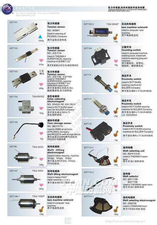 超誠電子科技有限公司在產品開發領域:成功研發出提花機電磁鐵、抬緯電磁鐵、電子多臂機電磁鐵、儲緯器電磁針、接近開關、緯紗傳感器、光電開關、光電探緯器、固態繼電器等產品,部分產品獲得了國際UL認證、CE認證等,受到了國部委的多次嘉獎。特別是本公司的高頻率提花機電磁鐵(SZT-003)、電子多臂機電磁棒(SZT-001-20)、節能型提花機組件(M5)、新型氣閥電磁鐵(TAU-2536),成為了國家商新技術產品,并通過了上海市高新技術成果轉化,得到了國家重點產品保護,本公司也被確認為全國質量、信譽雙保障示范企業,中國質量誠信委員會AAA級質量誠信會員,中國質量誠信促進會質量誠信消費者(用戶)信得過單位。