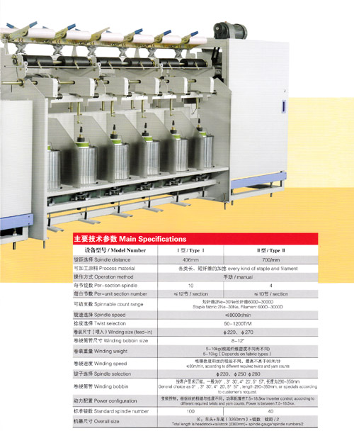 該機(jī)是我公司自行設(shè)計(jì)制造的一種新型大卷裝倍捻機(jī),主要適用于簾子線的復(fù)捻、地毯紗、帆布類粗支紗線的加捻等;短纖類最大卷裝可達(dá)6—8KG,化纖類最大可達(dá)10KG