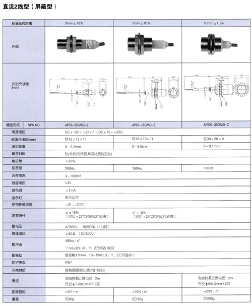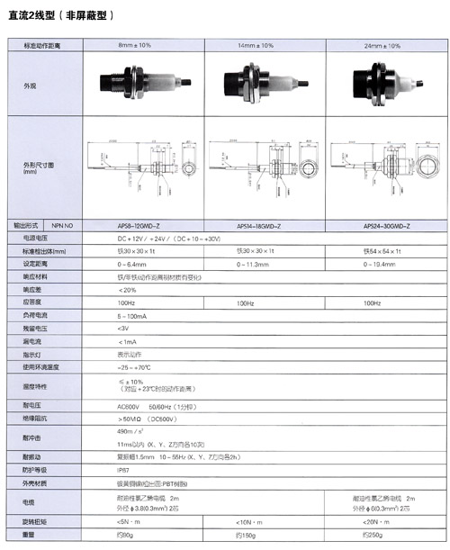 直流開關輸出、動作狀態可視型●優點寬范圍的動作距離在允許的范圍內可設定多種動作距離●動作狀態可觀察安裝時調整方便,在360℃的任意角度都可觀察動態