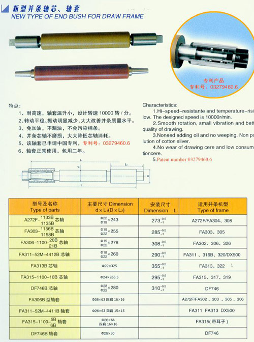特點:1、耐高速,軸套溫升小,設計轉速10000轉/分。2、轉動平穩、振動明顯減少,大大改善并條質量水平。3、免加油,不漏油,不會污染棉條。4、并條芯軸不磨損,大幅降低芯軸消耗。5、軸套已申請國家專利,專利號:03279460.6。6、軸套正常使用,包用兩年。