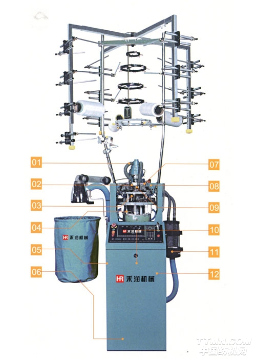“禾潤”牌HRlOP5型絲襪機是由電腦控制的具有二路標志系統的單針筒平紋高速絲襪機。該機采用獨立抽風機或中央抽風。系統進行織物牽拉,機器配備抗扭裝置。針筒轉動采用伺服電機直接驅動以減少轉動鏈及傳動誤差,由步進馬達控制針筒升降,可產生不同疏密、加壓潤滑油用以潤滑針織、生克和選針片。電腦控制襪子的制作全過程、款式和品質。該機可使用合成纖維、人造纖維以及裸氨綸和包覆紗等原料生產絲襪產品,包括短絲襪、長絲襪、連褲襪等多種絲襪產品。