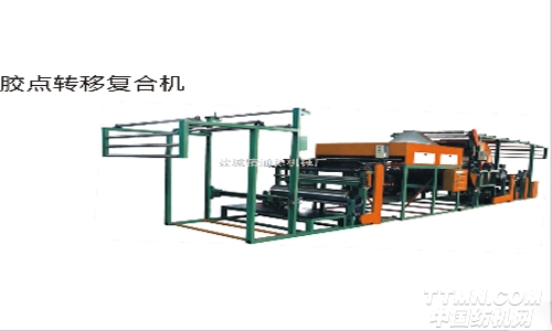 膠點轉移復合機技術參數用途:用于紡織品,無紡制品等高檔面料的上膠復合。特征:采用膠點轉移技術,將膠水以點狀形式轉移到里布上,然后與面布進行復合,使之成為一體。復合的面料同時具有耐干洗、砂洗、水洗等優點,尤其適用于人造毛皮,麂皮絨、搖粒絨的復合。里料、面料均配有自動對邊裝置。