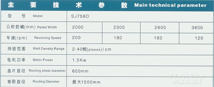 用 途 SJ758D型大卷裝劍桿織機,經優化設計而成。 該機適用于織造天然纖維(棉、毛、麻)、合成纖維、玻璃纖維、塑料絲繩及其它各類纖維等,尤其對工業用布及建筑用布更為適用。 特 點 采用獨立大卷取裝置,獨立電機傳動,卷取速度無級可調。 結構合理,性能穩定可靠、操作方便。 PLC控制、多色選緯、斷經斷緯自停、半自動供油、噪聲小、適用范圍廣。 采用特種劍頭、引緯、接緯可靠穩定。