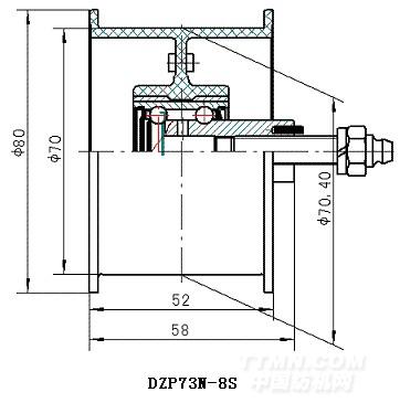 DZP73N-8S型錠帶張力盤產品帶輪直徑70mm,輪寬52mm,安裝尺寸M8,最高轉速10000轉/分。