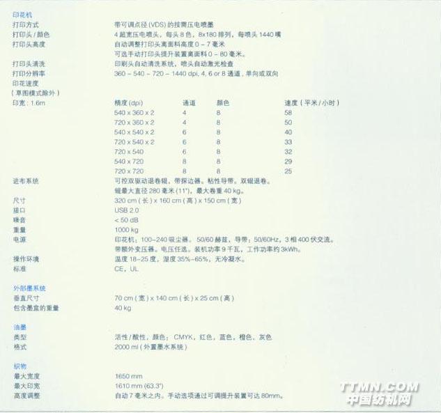 數碼印花機使用的超寬調點Epson打印頭,為達到最大速度和色譜,每頭噴射所有八色。噴頭與面料之間的距離由一個傳感器自動檢測。
