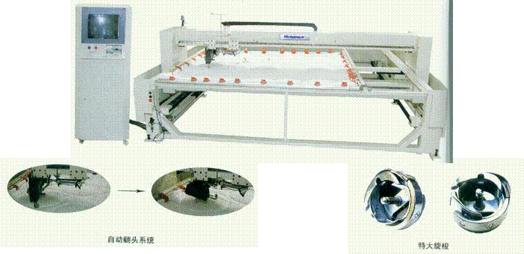 4、自動翻頭技術(shù),絎完一床物料后,機器自動翻頭,方便更換新料框