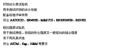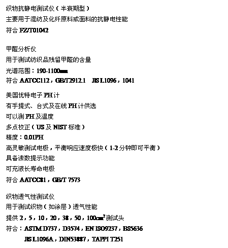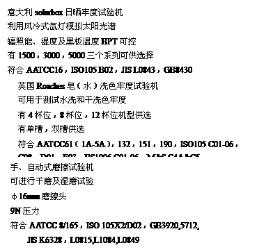 符合AATCC15,106,107,ISO105E01-E04、GB3922,GB5713,5714,DIN54005,54006,54007,54020