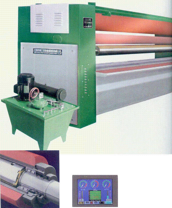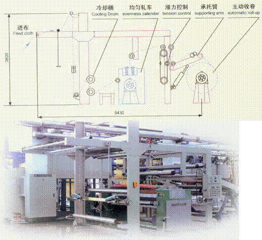 本機有進布機架,冷卻桶,均勻軋車,漲力控制器,承托臂,主動收卷等組成。