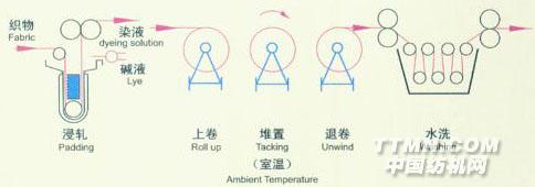 此工藝特點是:連續式軋染,間隙式堆置固色,染液和堿液分開配置。在染色時,用比例泵將染料和堿劑按比例混合(4∶1)后注入軋車染液槽中。染料和堿劑混合時間短,染料水解少,染浴穩定性良好。