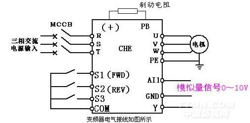 (3)頻率源為模擬量設(shè)定(電腦控制板輸出0~10VDC),只需要從AI1口輸入頻率指令;
