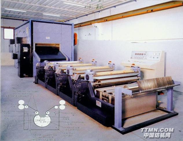 很多現代染色機制造商聲稱:現在已不必采用復洗工藝們的觀點是:在染色后,染色機內的高效沖洗已足以除有殘留雜質。但是在實際上,染缸的設計特點本身卻說不能在染色循環終端除凈所有雜質。裝載于染缸中的被毛,其作用類似于海綿,內含染液,因此要用盡可能多洗才能將浮色洗去。這種漂洗超時占用染缸,且耗用了的水。此外,羊毛染后必須烘干。而在復洗后道烘干為有利。因為在復洗后,羊毛的含濕量較低,且在毛條勻分布,這樣就可采用最低溫度烘干。復洗中的洗滌作用必須均勻。CMT環球機械有限公司所產的復洗機采用抽吸滾筒式設計,具有高效的洗液循環流量,迫使洗液穿透毛條,以確保將毛條中的浮色和殘留助劑洗掉。抽吸滾筒內部裝有吸液泵,確保洗液穿透毛條層,復洗槽運行速度系電子系統控制,使毛條以極低的張力通過復洗槽,這也進一步有助于洗液穿透毛條。
