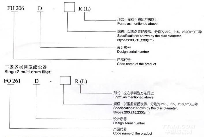 本聯合機為二級濾塵設備,組成本聯合機的一級和二級,其型號如下 一級圓盤預分離器: