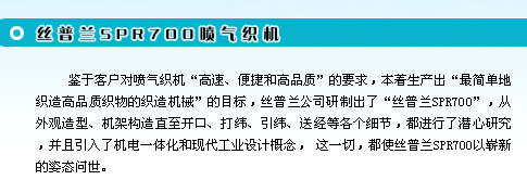公司擁有多名業內資深專家,并聯合國內著名大專院校的教授加盟,從而提升了公司產品開發的檔次,確保了產品后續研發的能力。公司建造的13000平方米的兩個生產車間已經啟用,Surprise絲普蘭SPR700噴氣織機已正式投入批量生產。