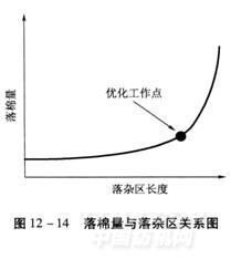 除塵刀與給棉羅拉和第一刺輥隔距點之間的距離,稱為第一落雜區(qū)長度,落雜區(qū)長度越大,排除的雜質(zhì)越多,但可紡纖維的損失也相應(yīng)增大。當落雜區(qū)長度在某個工作位置時,落棉中雜質(zhì)和可紡纖維的比例處在一個最恰當?shù)谋壤?,而落雜區(qū)長度越過這一優(yōu)化點,落棉量可能急劇增大,可紡纖維的損失也可能隨之增加(見圖12-14)。