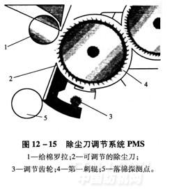 因此,除塵刀工藝調(diào)節(jié)要以落棉中雜質(zhì)與可紡纖維的比例為依據(jù)。TC03型梳棉機在吸風罩窗前安裝有落棉感應(yīng)器TC-WCT,用于評估落棉質(zhì)量的測色傳感器,根據(jù)氣流和吸風系統(tǒng)中的廢棉顆粒狀況,在落棉的某個集中點上進行選擇性探測,依據(jù)反射測量光束顏色的差異,辨別出落棉中的雜質(zhì)與可紡纖維的比例,優(yōu)化軟件根據(jù)輸送的信號,可確定除塵刀的最優(yōu)化位置。除塵刀被鑲嵌在一個環(huán)繞第一刺輥圓周的圓弧導軌上,當調(diào)節(jié)齒輪轉(zhuǎn)動時,就可使除塵刀沿圓弧導軌移動,進而調(diào)節(jié)第一落雜區(qū)長度。整個調(diào)節(jié)過程可在機器運轉(zhuǎn)時進行,通過電機驅(qū)動調(diào)節(jié)齒輪,結(jié)合計算機屏幕顯示的雜質(zhì)與可紡纖維的比例只需幾秒種即可實現(xiàn)調(diào)節(jié)過程,方便快捷。見圖12-15。