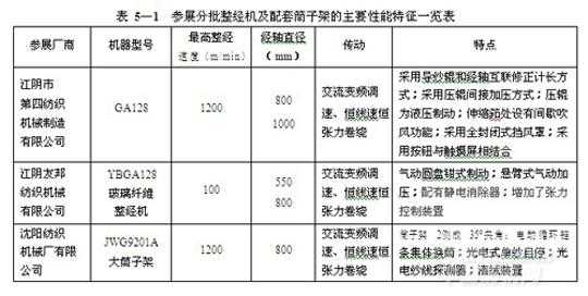 本屆展覽會(huì)實(shí)物參展的分批整經(jīng)機(jī)有江陰四紡機(jī) 和江陰市江陰友邦紡織機(jī)械有限公司 整經(jīng)機(jī)頭各1臺(tái)、沈陽紡織機(jī)械廠有限公司 大筒子架1臺(tái)。其他均以樣本的形式展出,產(chǎn)品型號(hào)與上屆基本相同,技術(shù)上變化不大。實(shí)物參展分批整經(jīng)機(jī)的主要技術(shù)參數(shù)及其特點(diǎn)見表 5—1。