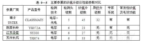 主要參展的紗疵分級儀性能參數(shù)對比 (表 9—5)