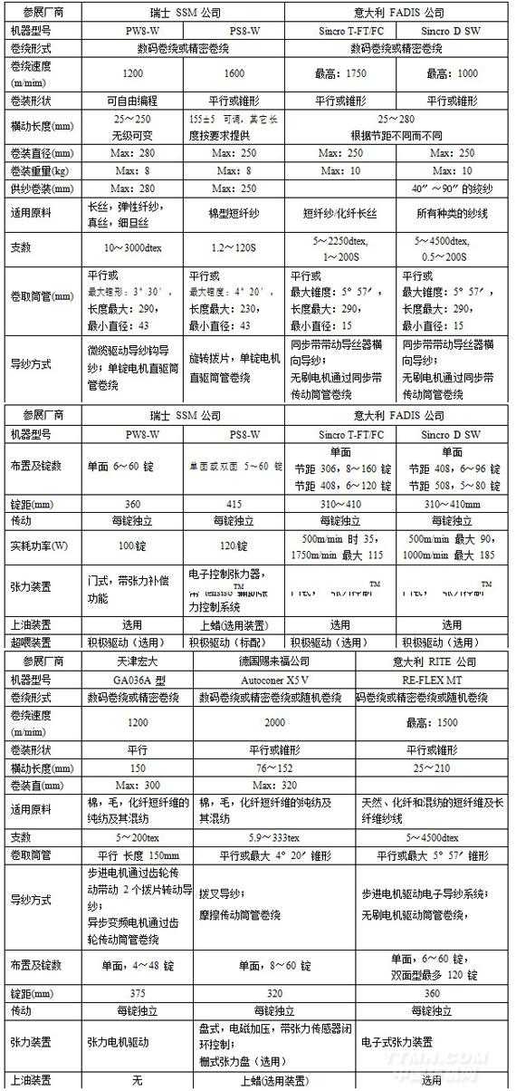 (1) 概述本屆展覽會有 9 家廠商展出自動絡(luò)筒機 15 臺,分別是:經(jīng)緯股份青島宏大紡織機械有限責任公司的 SMARO-I 細絡(luò)聯(lián)型自動絡(luò)筒機、SMARO-E 托盤式自動絡(luò)筒機、上海二紡機公司的 EJP438紗庫型自動絡(luò)筒機、東飛馬佐里公司的 DTM439 紗庫型自動絡(luò)筒機、江蘇凱宮機械股份有限公司的KGFA688 紗庫型自動絡(luò)筒機、浙江泰坦股份有限公司的 TZL-2008 紗庫型自動絡(luò)筒機、上海絡(luò)路機電科技有限公司的 MH-08G 紗庫型自動絡(luò)筒機,歐瑞康旗下賜來福(SCHLAFHORST)公司的AUTOCONER X5 V 細絡(luò)聯(lián)型自動絡(luò)筒機、日本村田(MURATEC)公司的 PROCESS CONER IIQPRO VCF 型自動絡(luò)筒機、PROCESS CONER II QPRO 托盤型自動絡(luò)筒機、PROCESS CONER IIQPRO 細絡(luò)聯(lián)型自動絡(luò)筒機(2 臺)、意大利薩維奧(SAVIO)公司的 POLAR-I 細絡(luò)聯(lián)型自動絡(luò)筒機、ORION SUPER M 紗庫型自動絡(luò)筒機(濟寧生產(chǎn))和 POLAR MR 筒倒筒自動絡(luò)筒機(1 錠)。