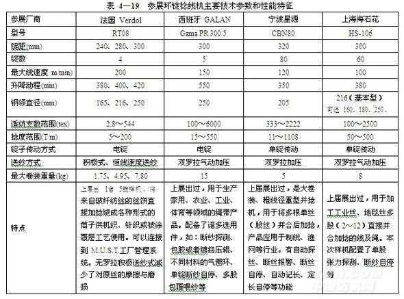 參展環(huán)錠捻線機(jī)主要技術(shù)參數(shù)和性能特征見表4-19。