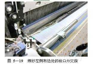 ONE S 200 N 8 SP是1臺很有特點的劍桿織機,最先在西班牙巴塞羅那的 ITMA 2011上展出,它采用了由 SMIT公司最新研發的 Smit One Gripper System(SOGS)單劍頭引緯交接系統,左側送緯側無劍帶,送緯劍安裝在 1個短軸上,此軸由伺服電機驅動。右側接緯劍由傳統的機械引緯機構和傳劍輪、劍帶驅動。引緯時送緯劍夾住緯紗后前進至靠近左側布邊處,此時接緯劍穿越整個梭口,在靠近左側布邊的梭口外完成緯紗交接并返回,完成引緯 (圖 5—19)。緯紗交接在梭口外完成,送緯劍不進入梭口,而接緯劍頭的橫截面積大大小于送緯劍,因此梭口可以開得更小些。根據 SMIT公司介紹,同傳統的雙側引緯、中央交接的引緯方式相比,“ONE”可減小經紗開口幅度,能夠適應各種類型的緯紗和織物,如復雜的精細織物、時裝面料、裝飾織物、安全防護織物、電路板玻纖織物、工業濾布、運動服面料等。同時,采用單側引緯、不在梭口中央進行緯紗交接,還有其他一些優點: