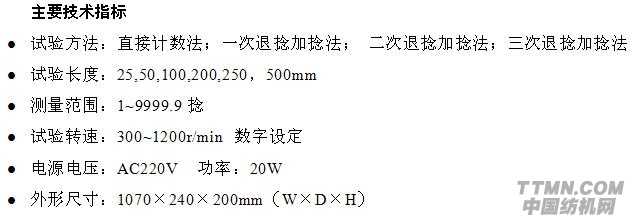 Y331N+半自動紗線捻度儀用于測定各種紗線的捻度及捻度不勻率。采用微電腦控制和大屏幕液晶屏,支持中英文菜單隨時切換,人機交互對話操作,具有斷電數據保存功能,打印輸出中文或英文報表。高精度滾動軸承支承的擺動片結合件轉動更靈敏可靠。適用標準如下:GB/T2543.1;GB/T2543.2;FZ/T10001;GB/T14345;ISO2061;BS2085;ASTMD1422/1423;JISL1095。