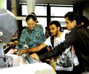 聊城由甲紡織機械有限公司總經理張艷芹向國外客戶介紹產品性能