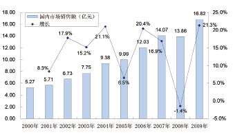 據(jù)統(tǒng)計(jì),國(guó)內(nèi)針布銷售額從2000年的5.3億元提高到2009年的16.8億元,年均復(fù)合增長(zhǎng)率為13.8%。2010年是紡織業(yè)發(fā)展較快的一年,國(guó)內(nèi)針布市場(chǎng)銷售額達(dá)到20.5億元,較2009年增長(zhǎng)21%以上。