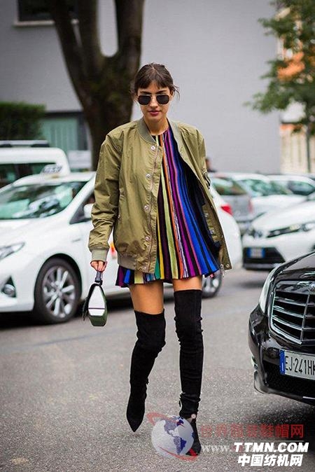 這個季節里外搭一件純色的棒球衣或牛仔外套是應對這種“五彩斑斕”最好的方法,如果覺得單穿這種裙子太花俏的姑娘可以這么做。外簡內繁的方式其實讓人的視覺更聚焦于你內搭的色彩,顯得非常明亮且活潑。出街的吸睛套路,難得穿一次,拜托,讓所有人都知道你穿了一件彩虹色的裙子吧。