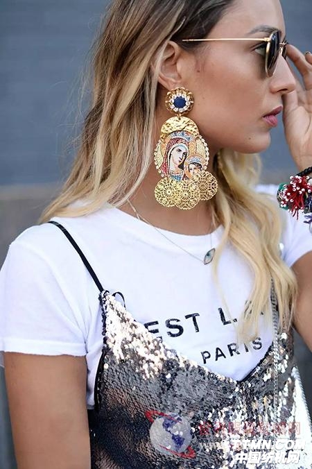 白色T恤搭配亮片吊帶衫,太潮了,一般人可不敢這么穿,特別是那夸張的耳環配飾,讓人眼前一亮,回頭率百分百。